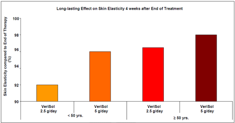 Met VERISOL collageen in NutraSkin zijn studies verricht naar het effect op verschillende aspecten van de huid, haar en nagels. In de onderzoeken zijn doseringen variërend van 2,5 tot 10 gram gebruikt. Bij de dosering VERISOL collageen van 2,5 gram werd al een zichtbaar anti-aging effect op huid, haren en nagels aangetoond. Na staken van het collageengebruik was het effect op de huidelasticiteit significant groter in de VERISOL-groep dan in de placebogroep. Dit laatste effect was groter bij vrouwen vanaf 50 jaar en groter bij inname van 5 gram dan bij gebruik van 2,5 gram (zie onderstaande afbeelding).